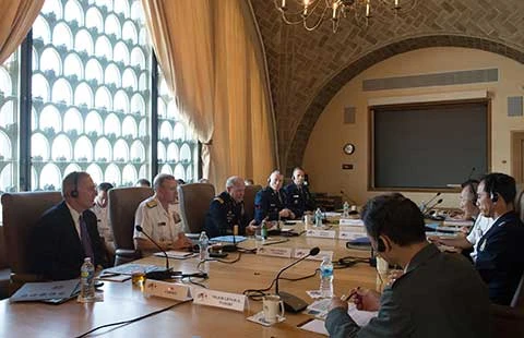 Tướng Martin Dempsey hội đàm với Đô đốc Katsutoshi Kawano tại căn cứ Lesley J. McNair ở Washington, D.C. ngày 16-7 (giờ địa phương). Ảnh: BỘ QUỐC PHÒNG MỸ