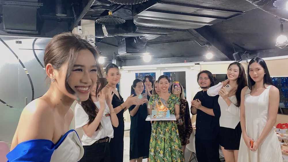 Hoa hậu Đỗ Hà nhận bánh kem chúc mừng từ các anh chị.