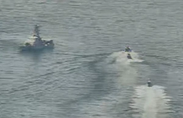 Hình ảnh xuồng máy cao tốc của Iran (trái) áp sát các tàu hải quân Mỹ ở vịnh Ba Tư gần vùng biển Kuwait ngày 15-4. Ảnh: US NAVY