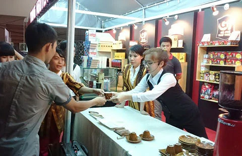 Các doanh nghiệp cà phê trong nước giới thiệu sản phẩm đến khách hàng tại lễ hội thử uống cà phê và quảng bá cà phê Việt Nam năm 2014 tại TP.HCM. Ảnh: QUANG HUY