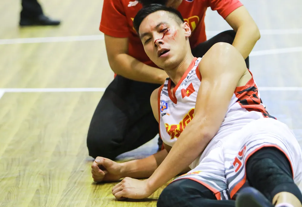 Cầu thủ Việt kiều Anthony Võ chấn thương rách mí mắt và nằm sân.