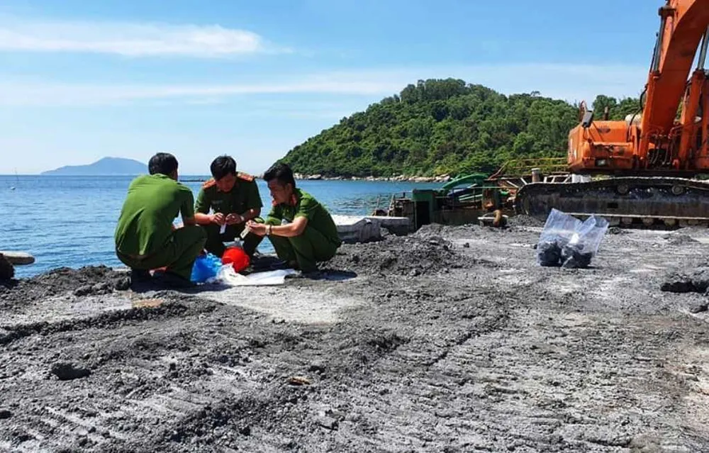 Cảnh sát lấy mẫu chất thải mà công ty xả xuống biển. Ảnh: H.H
