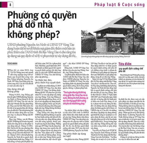 Đáng lưu ý là ngoài Nghị định 180 thì TAND TP Vũng Tàu và TAND tỉnh Bà Rịa-Vũng Tàu còn căn cứ vào Thông tư 02/2014 của Bộ Xây dựng để xét xử vụ án. Theo khoản 2b Điều 2 của thông tư này, đối với công trình xây dựng thuộc thẩm quyền cấp giấy phép xây dựng của UBND cấp huyện, UBND cấp xã phải chuyển hồ sơ vi phạm đến UBND cấp huyện để chủ tịch UBND cấp huyện ban hành quyết định cưỡng chế phá dỡ.