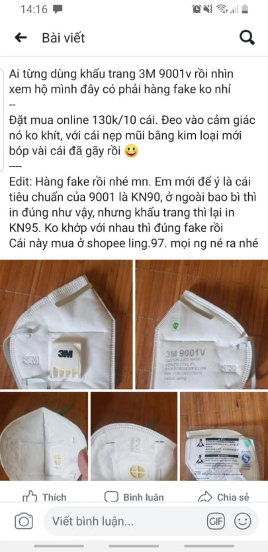 Một khách hàng mua phải khẩu trang chống bụi giả. Ảnh chụp màn hình