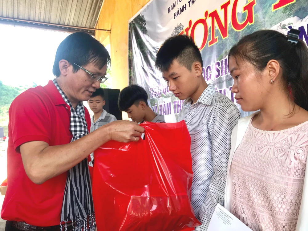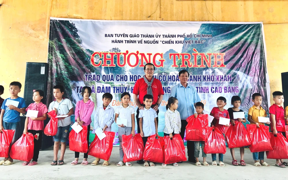 Cùng ngày, đoàn cũng tới thăm, tặng quà cho 100 em học sinh khó khăn của Trường Tiểu học Đàm Thủy và Trường THCS Đàm Thủy, thuộc xã Đàm Thủy, huyện Trùng Khánh, tỉnh Cao Bằng. Mỗi phần quà gồm balo học sinh, tập trắng, bánh Trung thu và 500.000 đồng.