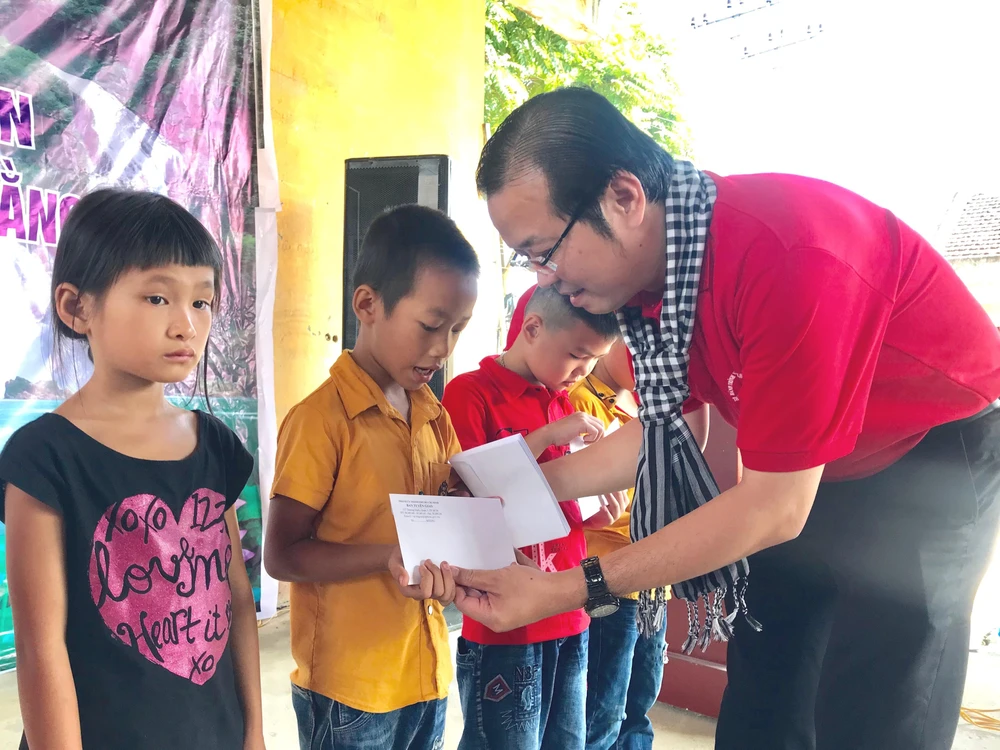 Ông Lê Văn Minh, Phó Trưởng ban Tuyên giáo Thành ủy TP.HCM, đang tặng quà cho các học sinh khó khăn.