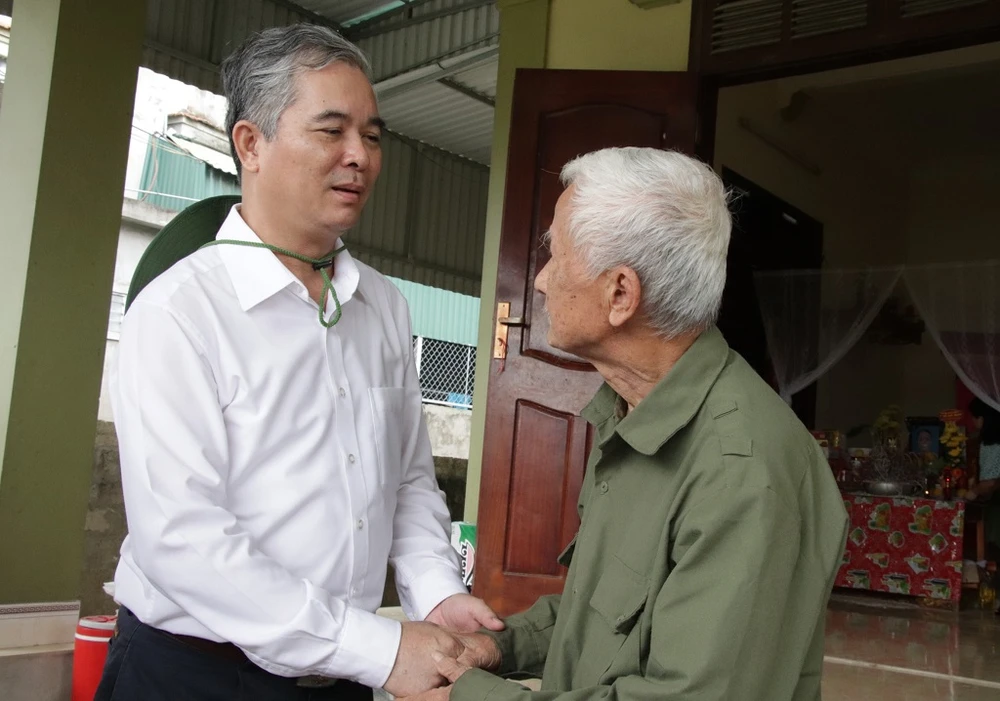 Phó Chủ tịch UBND TP.HCM Ngô Minh Châu thăm hỏi, động viên ông Trần Văn Ngụ. Con dâu của ông Ngụ đã qua đời vì đuối nước trong đợt lũ vừa qua. Ảnh: Uỷ ban MTTQ Việt Nam TP.HCM
