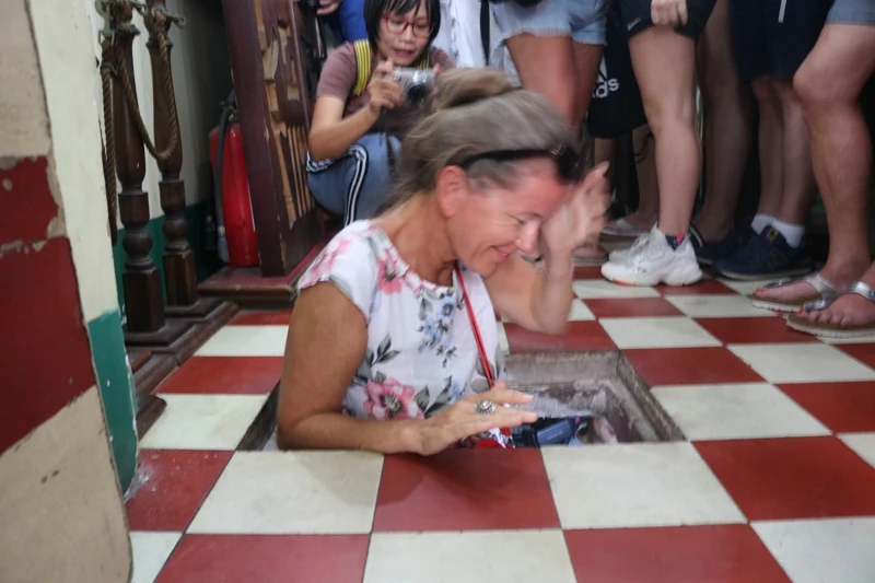 Du khách đang tham quan hầm chứa vũ khí của Biệt động Sài Gòn tấn công Dinh Độc lập tết Mậu Thân 1968.