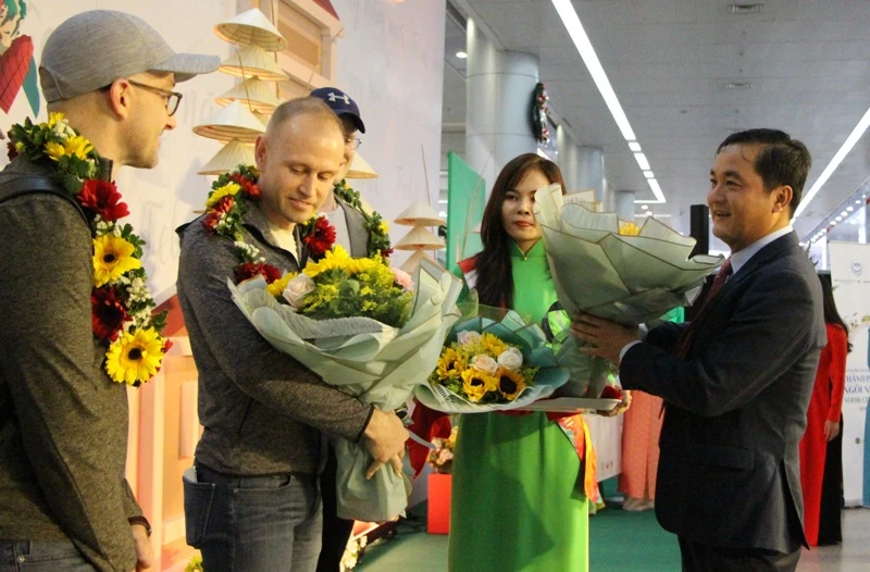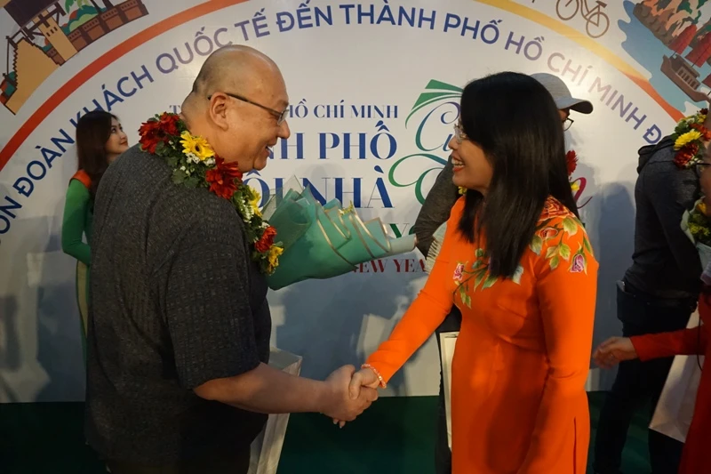 Ông Bùi Tá Hoàng Vũ, Giám đốc Sở Du lịch TP.HCM, tặng hoa cho những vị khách quốc tế đến TP.HCM sáng 1-1