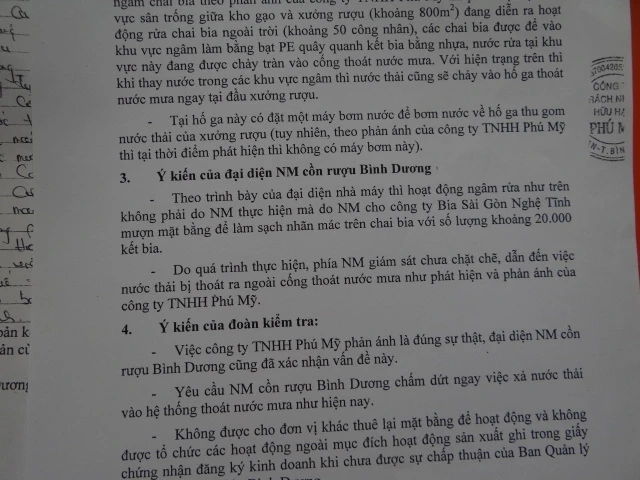 Qua khảo sát thực tế, đoàn kiểm tra môi trường tỉnh Bình Dương xác định, tại Nhà máy Rượu cồn Bình Dương có nước thải chảy tràn vào cống thoát nước mưa. Đại diện nhà máy này cho biết, họ đang cho Công ty bia Sài Gòn Nghệ Tĩnh mượn mặt bằng để làm sạch nhãn mác trên chai bia với số lượng 20.000 két. Trong quá trình thực hiện, phía nhà máy giám sát chưa chặt chẽ nên có hiện nước chảy tràn vào cống thoát nước mưa.