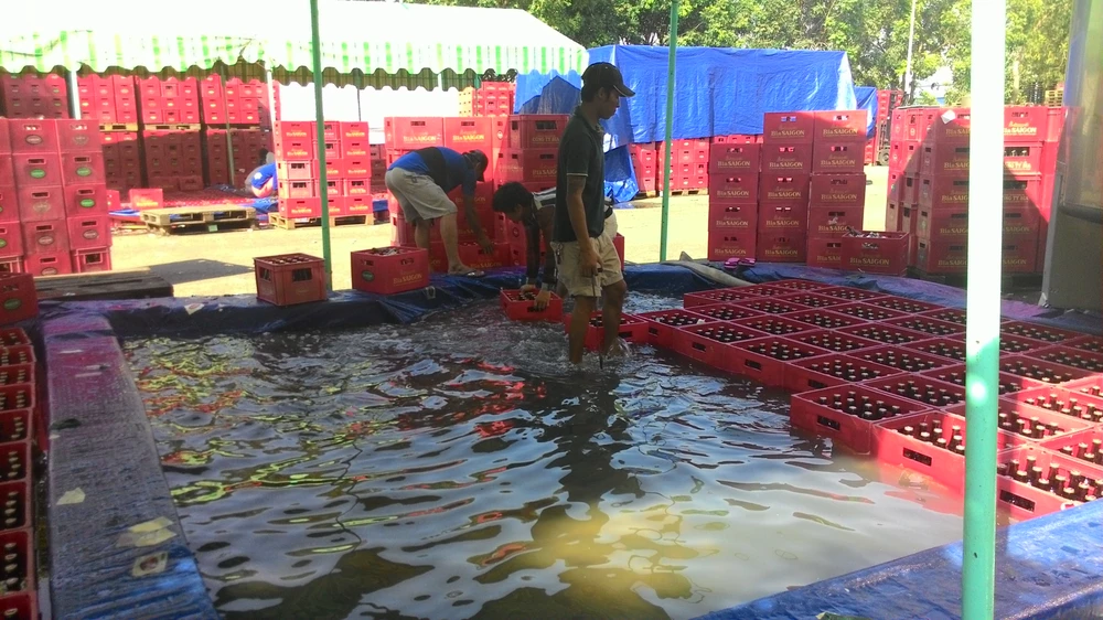 Nước thải phát sinh từ công đoạn làm sạch nhãn mác bia chảy tràn vào cống thoát nước. (tin_trungthanh_onhiem_hinh 1-2) (ảnh: K.B).