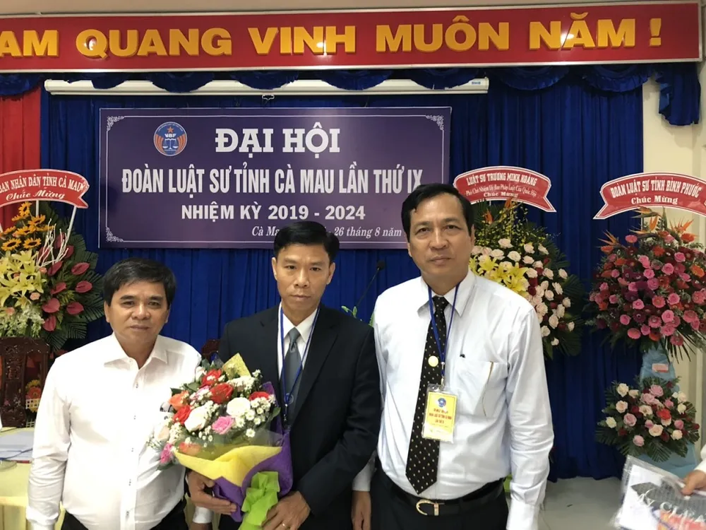Luật sư Lê Thanh Thuận (giữa) được Phó Chủ tịch UBND tỉnh Cà Mau Trần Hồng Quân (phải) tặng hoa hôm Đại hội.