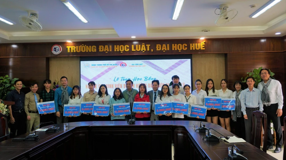 Đoàn trao học bổng cho sinh viên có hoàn cảnh khó khăn ở Đại học Luật, Đại học Huế. Ảnh: Đoàn Luật sư TP.HCM.