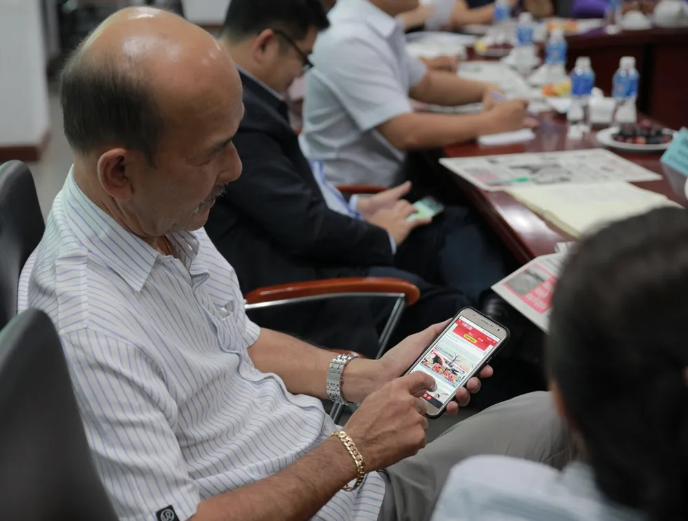 Một nhà báo Lào đang xem trang báo điện tử Pháp Luật TP.HCM trên thiết bị di động.