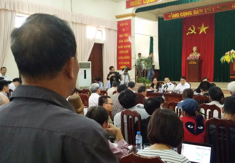 Người dân Đồng Tâm đối thoại với Chủ tịch Hà Nội Nguyễn Đức Chung vào sáng 22-4 tại hội trường UBND xã Đồng Tâm. Ảnh: TP