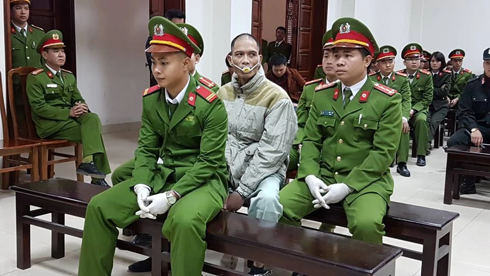 Bị cáo Dũng được đưa đến tòa trong tình trạng khá hốc hác và mệt mỏi. Bị cáo bị buộc phải ngậm dụng cụ chuyên dụng để chống cắn lưỡi tự tử.