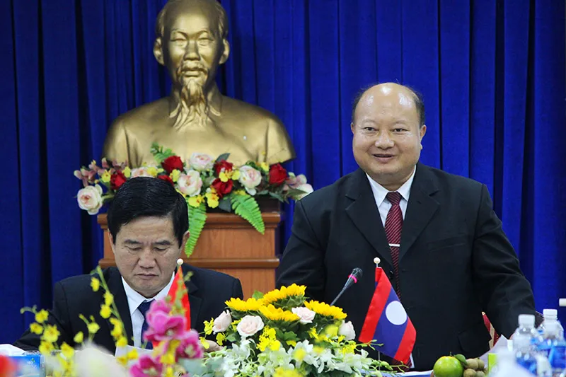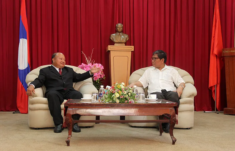 Giám đốc Sở Tư pháp tỉnh Luang prabang (Lào) Myxay Xaycoyangchongtua (bìa trái) làm việc với Tổng lãnh sự quán Lào tại TP.HCM. Ảnh: HOÀNG GIANG
