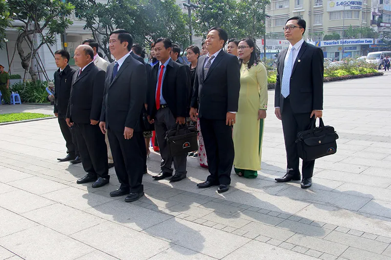Đoàn Sở Tư Pháp Lào và Sở Tư Pháp TP.HCM dành một phút mặc niệm trước tượng đài chủ tịch Hồ Chí Minh, sáng 20-6. Ảnh: HOÀNG GIANG