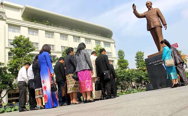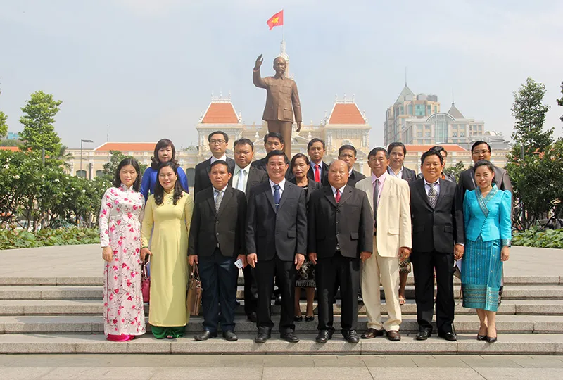 Đoàn Sở Tư Pháp Lào và Sở Tư Pháp TP.HCM chụp ảnh lưu niệm với tượng đài chủ tịch Hồ Chí Minh, sáng 20-6. Ảnh: HOÀNG GIANG