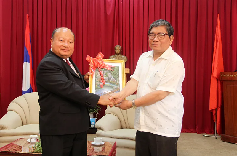 Giám đốc Sở Tư pháp tỉnh Luang prabang (Lào) Myxay Xaycoyangchongtua (bìa trái) tặng quà lưu niệm cho Tổng lãnh sự quán Lào tại TP.HCM. Ảnh: HOÀNG GIANG