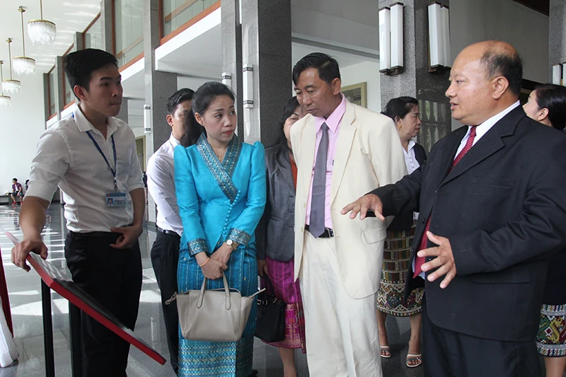 Giám đốc Sở Tư pháp tỉnh Luang prabang (Lào) Myxay Xaycoyangchongtua (bìa phải) đặt câu hỏi khi tham quan Dinh Độc Lập. Ảnh: HOÀNG GIANG