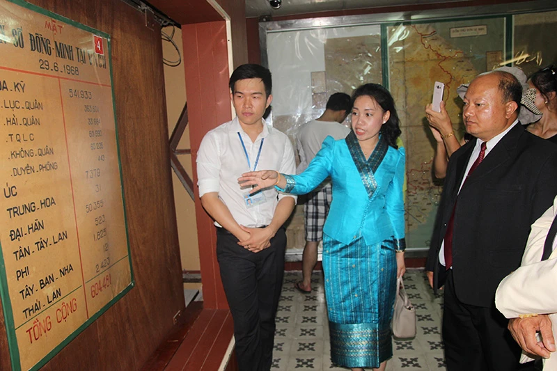 Giám đốc Sở Tư pháp tỉnh Luang prabang (Lào) Myxay Xaycoyangchongtua (bìa phải) nghe giới thiệu về đường hầm bọc thép dưới Dinh Độc Lập. Ảnh: HOÀNG GIANG
