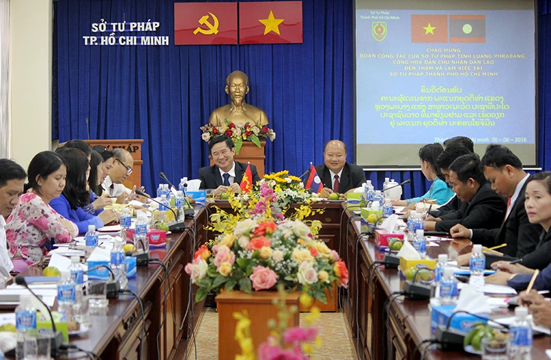 Đoàn Sở Tư Pháp tỉnh Luang prabang (Lào) làm việc với Sở Tư Pháp TP.HCM. Ảnh: HOÀNG GIANG