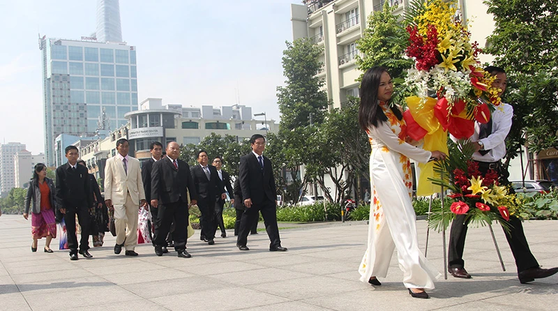 Đoàn Sở Tư Pháp Lào và Sở Tư Pháp TP.HCM dâng hoa tượng đài chủ tịch Hồ Chí Minh, sáng 20-6. Ảnh: HOÀNG GIANG