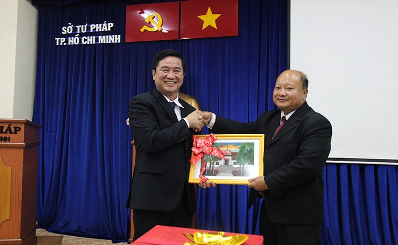 Giám đốc Sở Tư Pháp Sở Tư Pháp tỉnh Luang prabang Myxay Xaycoyangchongtua (bìa phải) tặng quà lưu niệm cho Giám đốc Sở Tư Pháp TP.HCM Huỳnh Văn Hạnh. Ảnh: HOÀNG GIANG