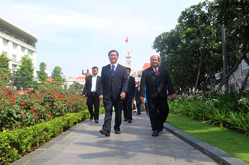 Giám đốc Sở Tư pháp TP.HCM Huỳnh Văn Hạnh và Giám đốc Sở Tư Pháp tỉnh Luang prabang (Lào) Myxay Xaycoyangchongtua dạo bộ trên phố Nguyễn Huệ. Ảnh: HOÀNG GIANG