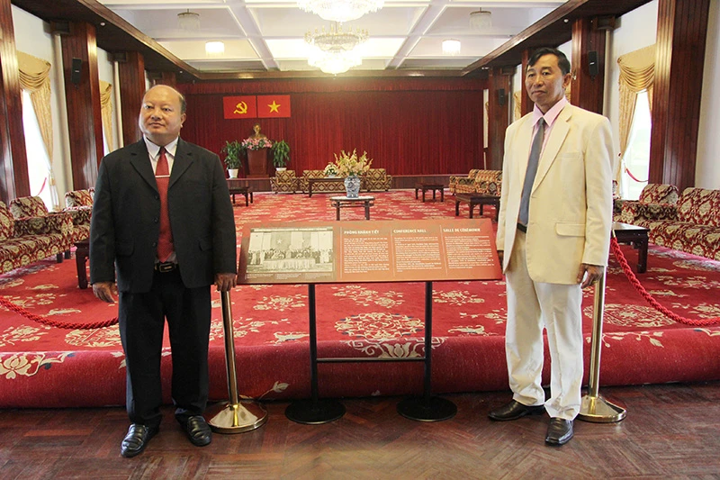 Giám đốc Sở Tư pháp tỉnh Luang prabang (Lào) Myxay Xaycoyangchongtua (bìa trái) chụp ảnh lưu niệm tại phòng khánh tiết trong Dinh Độc Lập. Ảnh: HOÀNG GIANG