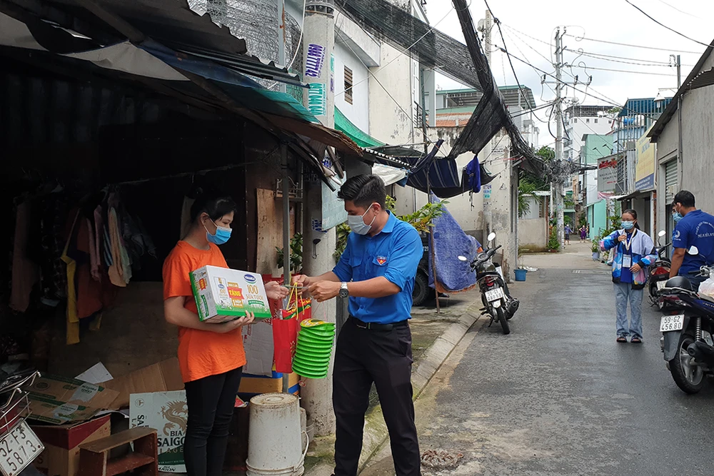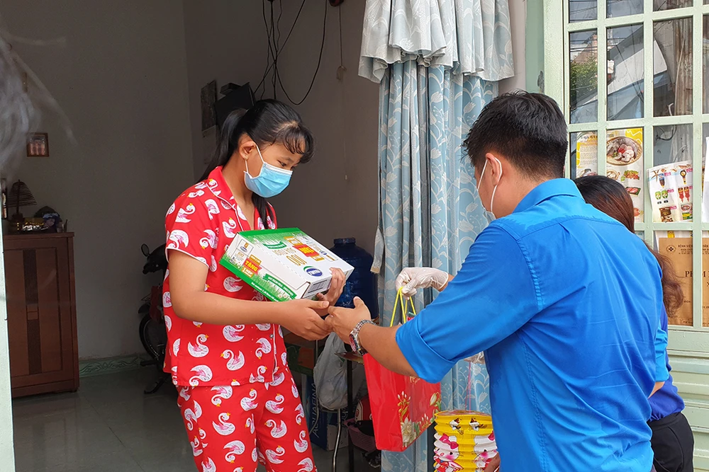 Đoàn viên thanh niên phường Tân Hưng Thuận đến từng gia đình đang gặp khó do dịch COVID trao quà Trung thu. Ảnh NT