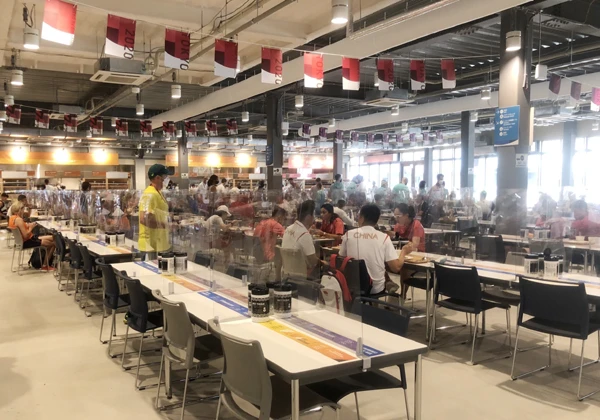 Khu vực ăn uống của đoàn TTVN phục vụ 24/24 với đa dạng các món ăn Á, Âu. Mỗi bàn ăn đều có thiết kế vách ngăn kính trong, nhằm hạn chế tiếp xúc, giao tiếp giữa các đoàn. Đây là giải pháp nhằm hạn chế đến mức tối đa về các trường hợp lây nhiễm dịch bệnh COVID-19.