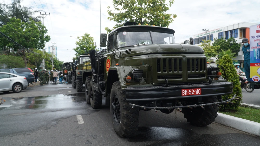 Đoàn xe quân đội phun thuốc khử trùng tại quận Sơn Trà