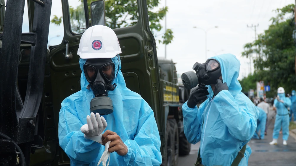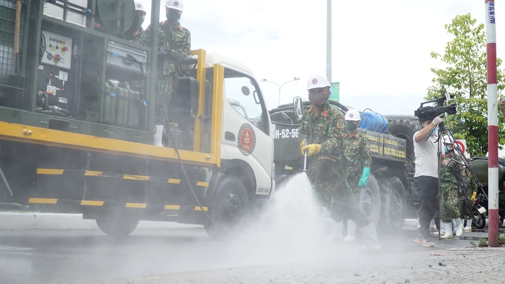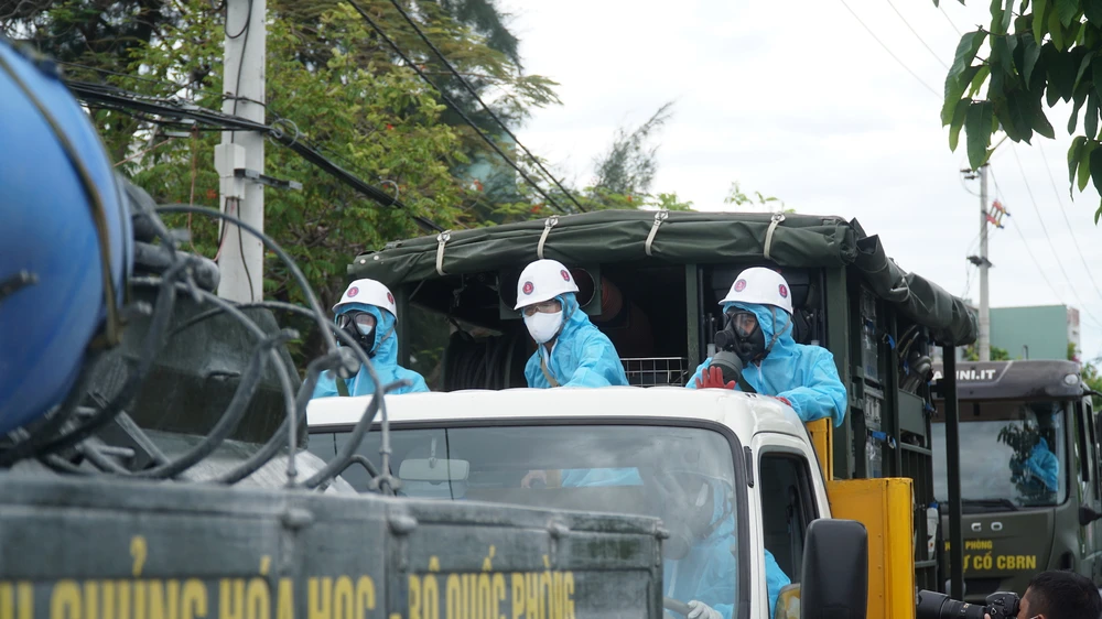 Khoảng 13 giờ 30 ngày 3-8, 30 chiến sĩ thuộc Binh chủng hóa học phối hợp với các đơn vị Quân khu 5 cùng 7 xe đặc chủng tập trung tại Trung tâm Y tế quận Sơn Trà. Tất cả chuẩn bị cho công tác phun thuốc diệt khuẩn phòng dịch COVID-19 trên toàn địa bàn quận Sơn Trà.
