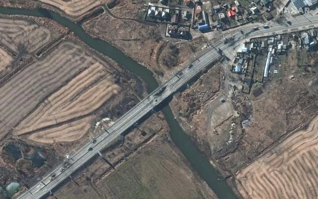 Một cây cầu bị hư hại gần thành phố Irpin và Stoyanka. Ảnh: MAXAR TECHNOLOGIES