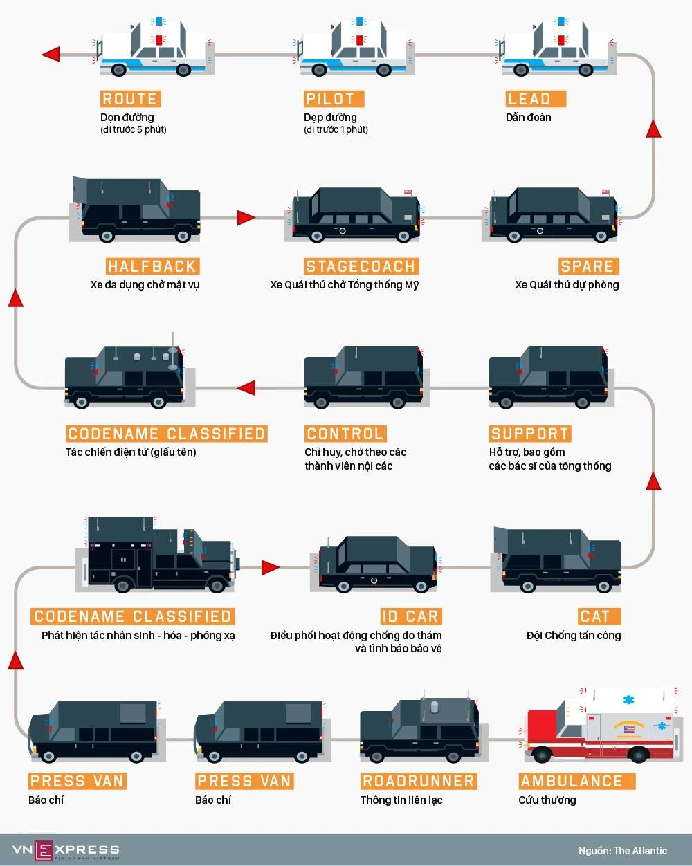 Đoàn hộ tống có gần 20 xe đảm nhận các vai trò khác nhau, nhằm bảo đảm an toàn cho tổng thống Mỹ trong mọi tình huống.