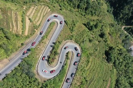 Tới cung đường từ Phố Cáo về Sủng Là, đoàn caravan gần 100 xe VinFast qua dốc Chín Khoanh với rất nhiều khúc cua chữ U cực kỳ đặc sắc của vùng cao Hà Giang.