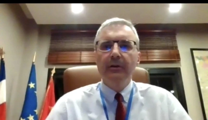 Phái đoàn ngoại giao thuộc Liên minh Châu Âu tại cuộc họp báo trực tuyến. Ảnh chụp từ màn hình.
