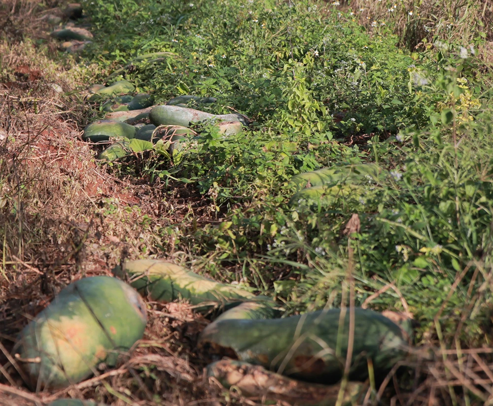 Chúng tôi gặp ông Nguyễn Văn Bát, người đã đầu tư gần 7 ha bí đao xanh giống Đài Loan, khi ông cùng nhiều người chất những quả bí đao nặng 10-15 kg thành đống để công nhân làm cỏ chuẩn bị bón phân cho cây cao su. Những quả bí đao nằm la liệt, bắt đầu bị thối rữa.