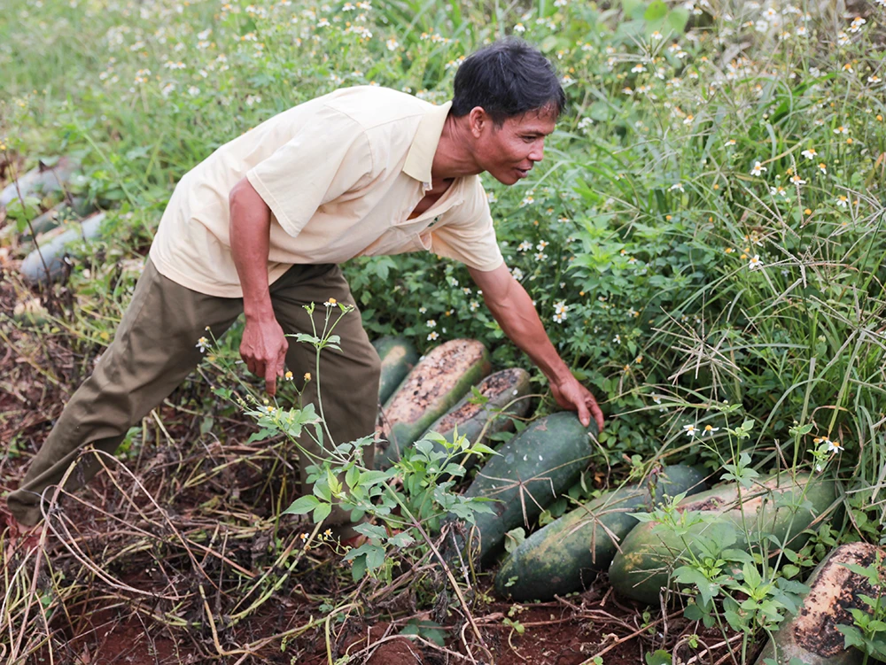 Ông Bát cho biết mùa thu hoạch đã qua hơn hai tháng nhưng ông không dám cắt vì không có người mua. Một số hộ có mang bí đao ra bày sạp bên quốc lộ 14 để bán cho người đi đường nhưng cũng không ai dám mua vì trái… quá lớn.