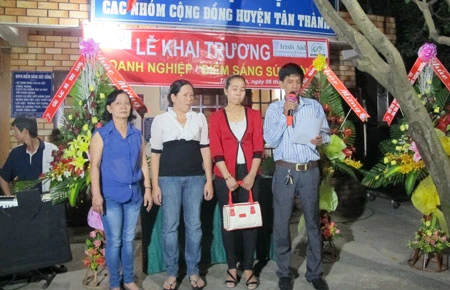 Vợ chồng anh Phạm Ngọc Tuấn (người ngoài cùng và thứ hai từ trái sang) trong ngày khai trương DNTN Điểm sáng Sức sống. Ảnh: TK