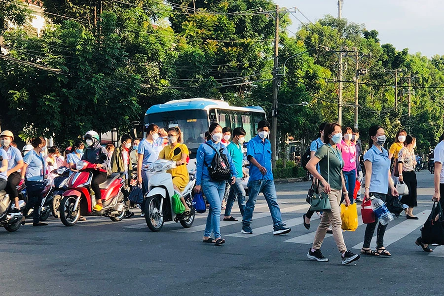 Trong ảnh: Công nhân đang trên đường đến nhà máy. Ảnh: PHONG ĐIỀN