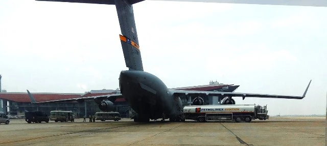Petrolimex Aviation tiếp nhiên liệu cho Boeing C-17 Globemaster III của U.S Air Force tại Cảng Hàng không quốc tế Đà Nẵng.