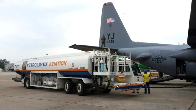 Petrolimex Aviation tiếp nhiên liệu cho Lockheed C-130 Hercules của U.S Air Force tại Nội Bài.