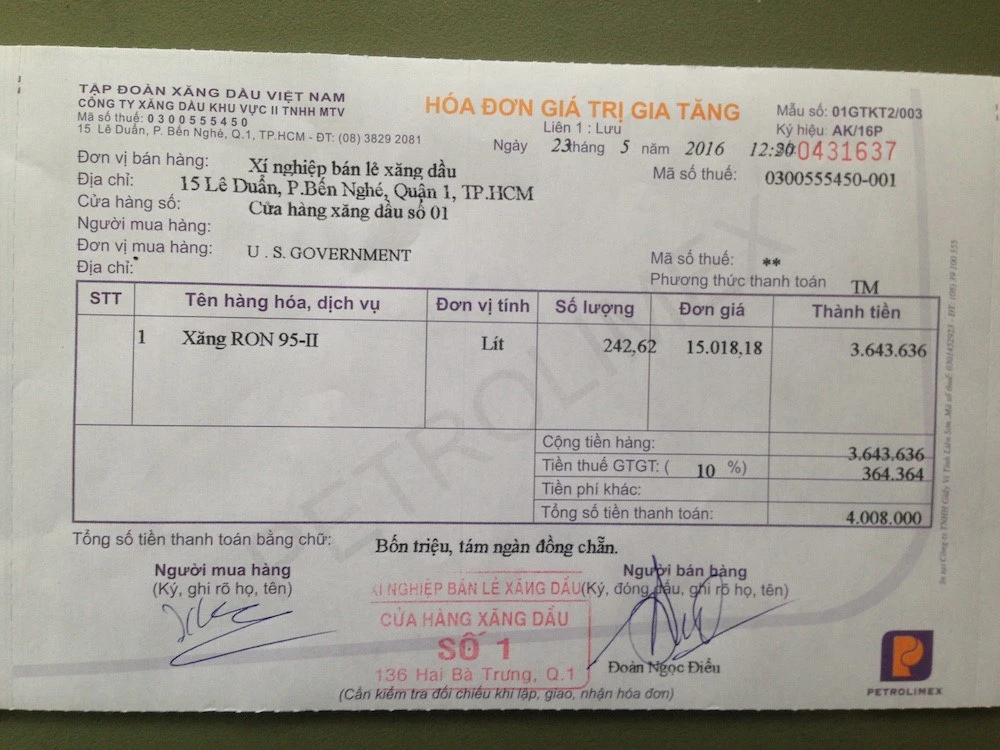 Hóa đơn VAT ghi đơn vị mua hàng là U. S Goverment