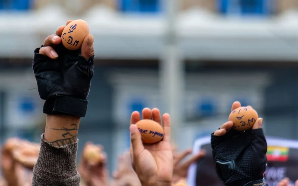 Theo The Guardian, người biểu tình tại Myanmar ngày 4-4 đã thực hiện một cách thức truyển tải thông điệp phản đối chính biến mới, đó chính là ghi các thông điệp lên những quả trứng luộc.