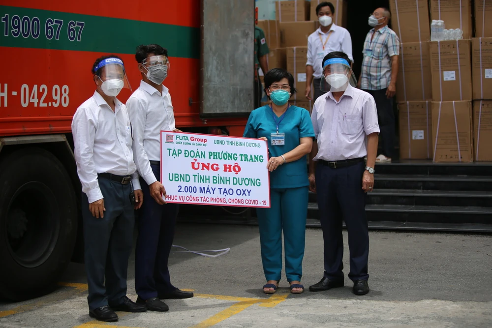 Trước đó, ngày 16-8, đại diện Tập đoàn Phương Trang đến thăm và trao tặng Bệnh viện Nhân dân 115 (TP.HCM) gói hỗ trợ giúp bệnh viện có thêm trang thiết bị y tế phục vụ công tác điều trị bệnh nhân COVID-19, gồm 20 máy trợ thở, 400 máy tạo ôxy và 1.000 dụng cụ SpO2 đo nồng độ ôxy trong máu, tổng trị giá gần 18 tỉ đồng.