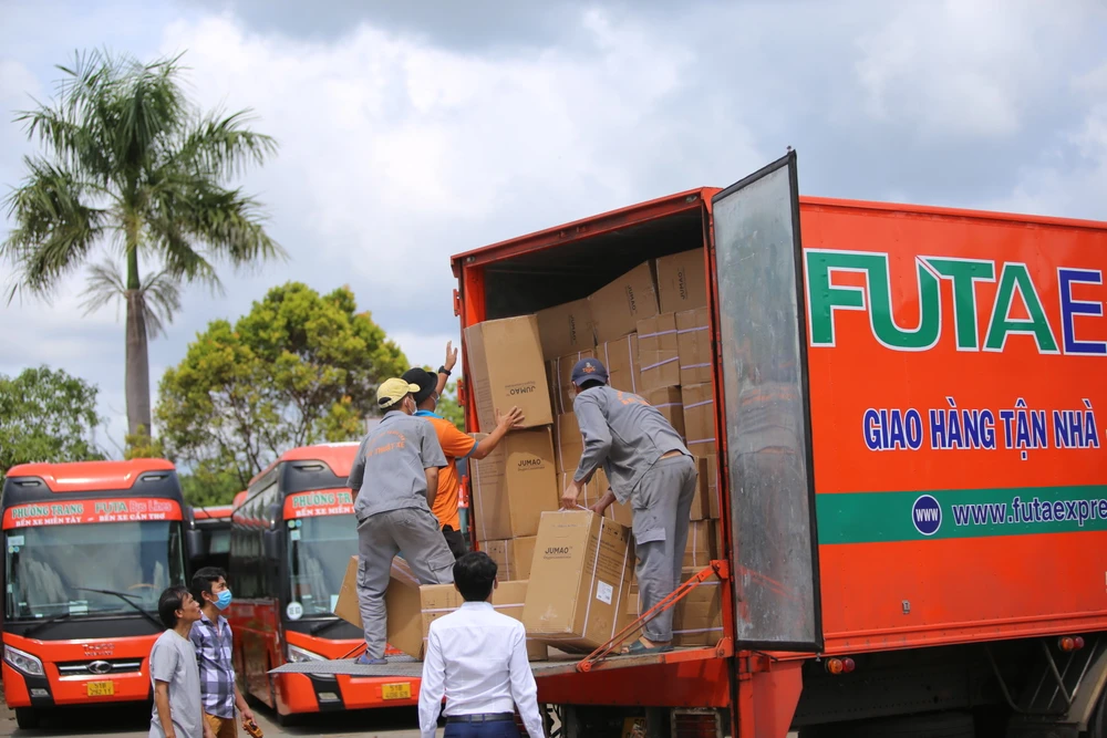 Nhân viên Tập đoàn Phương Trang chất máy tạo ô xy lên xe vận chuyển đến Bình Dương sáng 23-8.