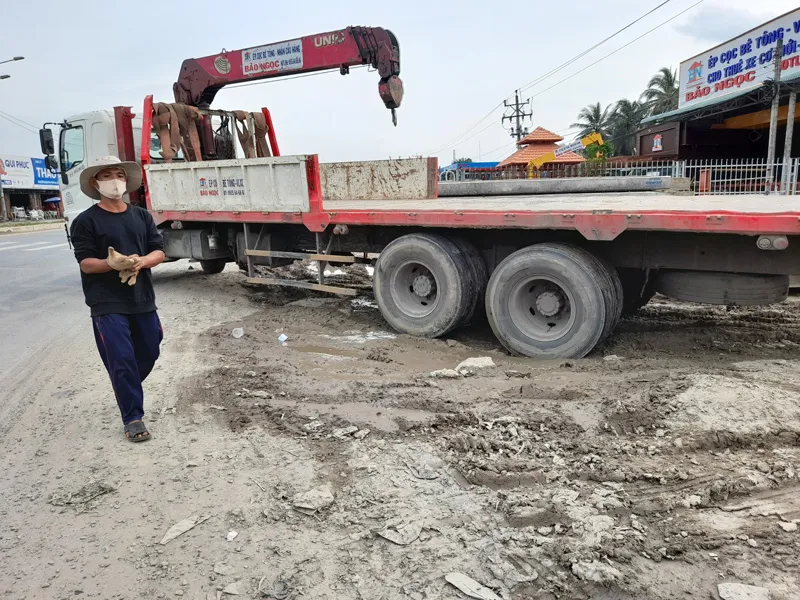 Xe cơ giới thường xuyên ra vào chở vật tư thiết bị khiến hành lang QL60 bị hư hỏng nặng. Ảnh: Đ.Hà